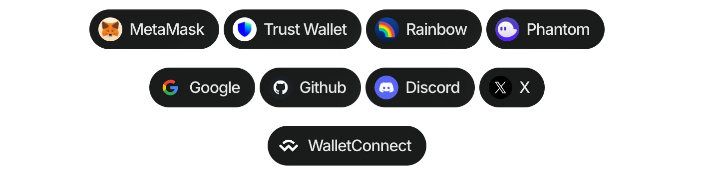 | Social logins | google, github, apple, facebook, x, discord, and farcaster |